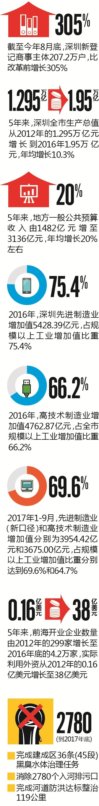 在創(chuàng)新驅動發(fā)展戰(zhàn)略推動下,深圳“大眾創(chuàng)業(yè)萬眾創(chuàng)新”蓬勃發(fā)展,中外創(chuàng)客匯聚于此。人才與創(chuàng)新為深圳經(jīng)濟社會發(fā)展提供源源不斷的活力和潛力。5年來,深圳全市生產(chǎn)總值從2012年的1.295萬億元增長到2016年1.95萬億元,年均增長10.3%;地方一般公共預算收入由1482億元增至3136億元,年均增長20%左右。