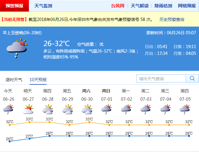 深圳市氣象臺預(yù)計(jì)明天多云,有陣雨或雷陣雨;26-32℃;南風(fēng)2-3級;27-30日天氣炎熱到酷熱,午后易發(fā)局地短時熱雷雨,最高氣溫33-34℃,局地35℃或以上,請市民做好防暑降溫。