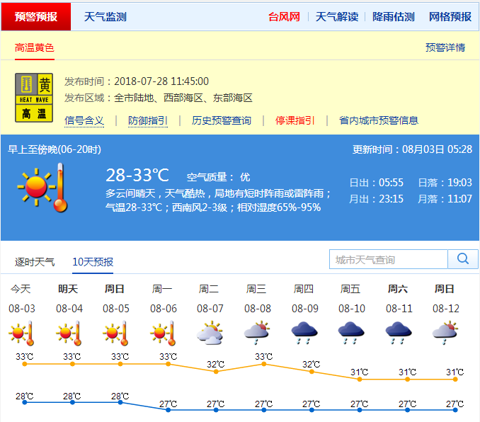 近期天氣方面,預計3日多云間晴天,天氣酷熱,局地有短時陣雨或雷陣雨,氣溫27-33℃,北部和人口密集區(qū)局地最高氣溫可達35℃;4-7日多云,局部有短時(雷)陣雨。請注意持續(xù)高溫下的防暑降溫和戶外活動、戶外作業(yè)的安全;關(guān)注局地雷雨的影響,發(fā)布雷電預警時,需遠離高山、開闊的地方以及樹下、較淺的山溝或者山洞、水面等地區(qū)。