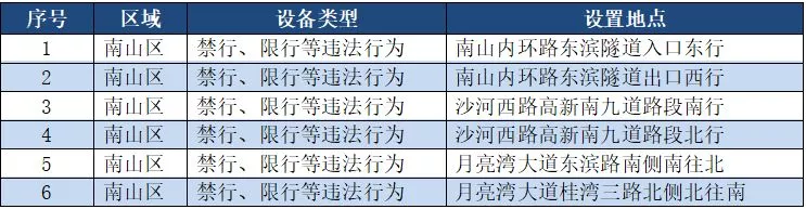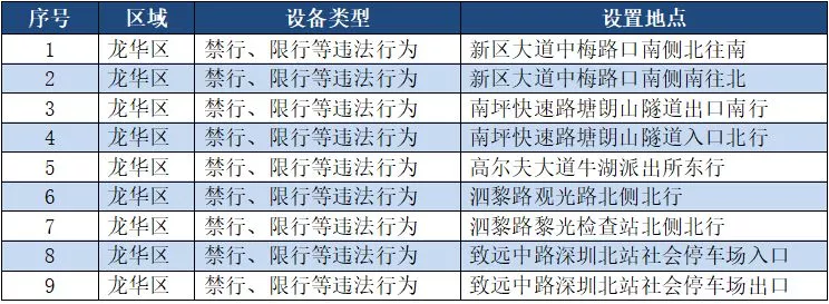 另外,重點(diǎn)整治機(jī)動(dòng)車(chē)禁行、限行等多種違法行為的交通技術(shù)監(jiān)控設(shè)備,深圳交警公布啟用87套。涉及福田區(qū)、羅湖區(qū)、南山區(qū)、寶安區(qū)、龍崗區(qū)、龍華區(qū)、光明新區(qū)、坪山區(qū)、大鵬新區(qū)等9個(gè)區(qū)域。