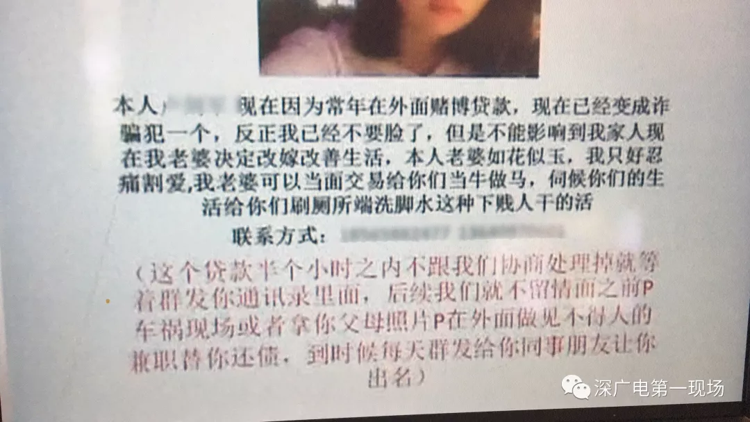 今天上午,記者在龍崗坪地一小區(qū)外見到了盧先生,他告訴記者,最近手機(jī)收到這樣一張圖片,圖片恰巧是他的一位女性朋友頭像,下面還配上一些關(guān)于“幫盧先生還債”的不實(shí)文字信息,內(nèi)容是盧先生已經(jīng)成了詐騙犯,現(xiàn)在正在當(dāng)“洗腳妹”幫盧先生還賬,圖片上還有盧先生的個(gè)人資料和電話號(hào)碼。