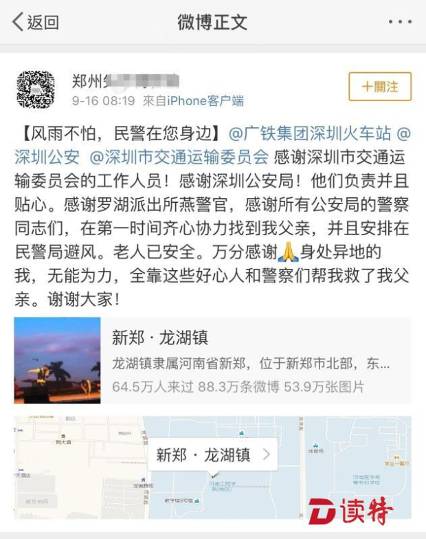 原標(biāo)題:臺(tái)風(fēng)天老人坐不上火車,和在河南的女兒失聯(lián)!深圳警方徹夜尋找