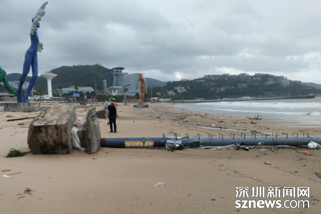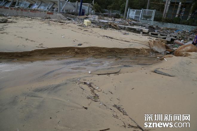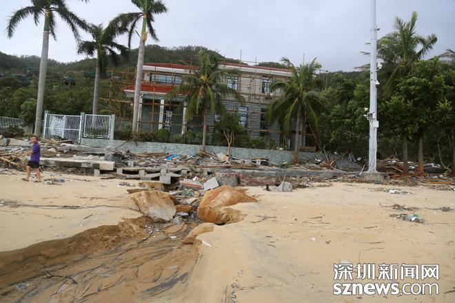 小梅沙旅游度假村景區(qū)內沙灘海沙被卷走超7萬多立方,約2000米的堤岸及道路沖垮,公共、建筑設施及構筑物全部受損,部分完全損毀,13處經營管理場所損毀,綠化、樹木等嚴重破壞,直接經濟損失預估超過5000萬元。