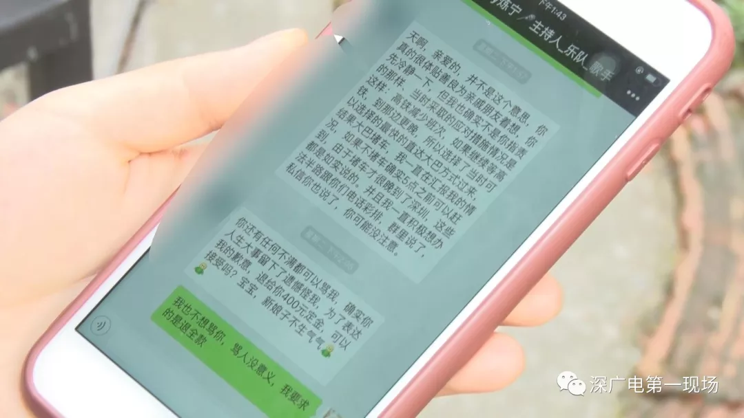 事情發(fā)生之后,李女士也多次和司儀小寧進(jìn)行溝通,要求對(duì)方退還全部訂金或者當(dāng)面賠禮道歉,一開(kāi)始對(duì)方的態(tài)度還很好,并且退還了400元的定金,但最近幾天就不怎么搭理了。