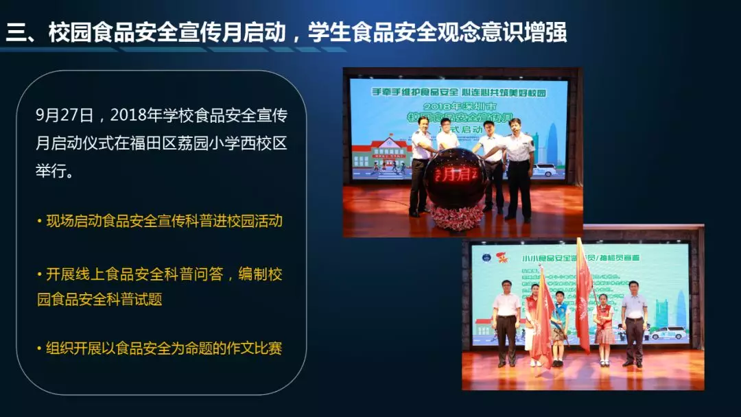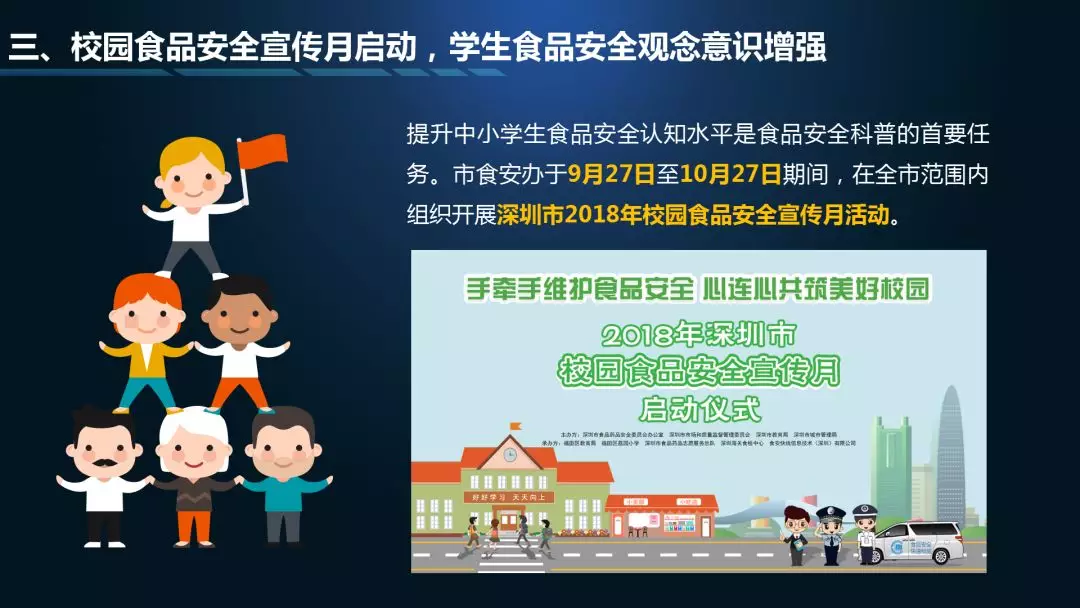 第一個(gè)“3”指“九號(hào)查酒”節(jié)前專(zhuān)項(xiàng)行動(dòng)、校園食品安全宣傳月、深圳市食藥志愿者總隊(duì)開(kāi)展打擊非法售賣(mài)活禽專(zhuān)項(xiàng)執(zhí)法行動(dòng)等情況通報(bào);