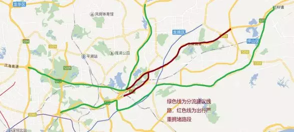 往深汕方向的可以在水官高速提前下高速走龍崗大道轉橫坪公路在坑梓上深汕高速,建議車輛避開擁堵路段和時間段前往。