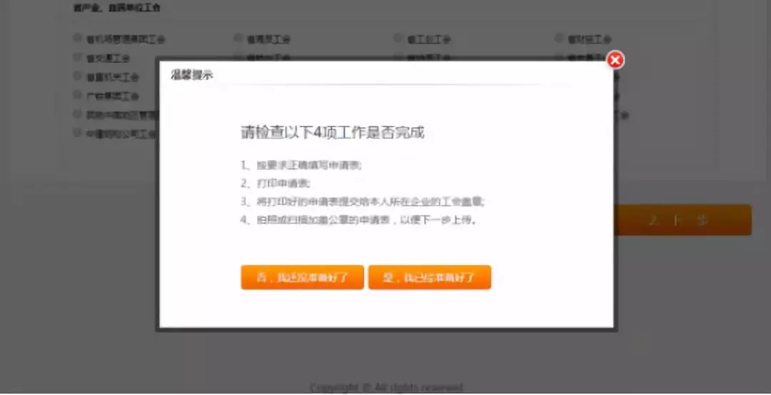 2.根據(jù)“溫馨提示”確認(rèn)是否已完成,如果未完成,點(diǎn)擊【否,我還沒準(zhǔn)備好】,并隨后完成所有工作;如果已完成,點(diǎn)擊【是,我已經(jīng)準(zhǔn)備好了】,進(jìn)入下一個(gè)頁(yè)面。在申報(bào)過程中,長(zhǎng)時(shí)間在網(wǎng)站頁(yè)面停留,會(huì)遇到頁(yè)面過期,遇到此問題需重新登錄;