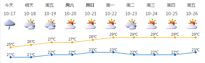 我市陰天間多云,有小雨;氣溫21-26℃;東北風(fēng)2-3級(jí);相對(duì)濕度70%-95%