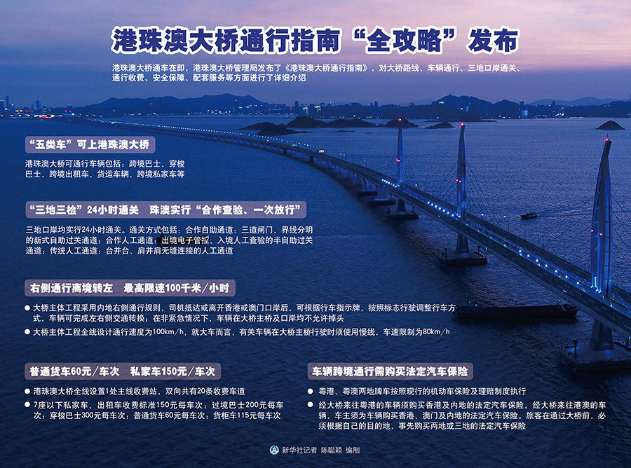 新華社廣州10月21日電(記者周強)港珠澳大橋通車在即,港珠澳大橋管理局發(fā)布了《港珠澳大橋通行指南》,對大橋路線、車輛通行、三地口岸通關、通行收費、安全保障、配套服務等方面進行了詳細介紹。