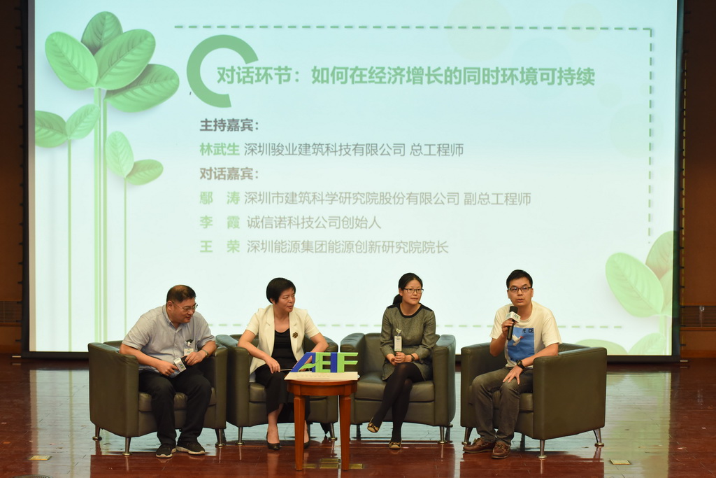 “如何在經(jīng)濟(jì)增長的同時環(huán)境可持續(xù)”是10月27日論壇的最后一個對話環(huán)節(jié),由深圳駿業(yè)建筑科技有限公司總工程師林武生擔(dān)任嘉賓主持,來自來自深圳能源集團(tuán)能源創(chuàng)新研究院的王榮院長、深圳市建筑科學(xué)研究院股份有限公司副總工程師鄢濤、誠信諾科技公司創(chuàng)始人李霞不僅對競賽單元的4個項目以及之前的嘉賓分享內(nèi)容進(jìn)行了點評和回顧,在介紹各自所在企業(yè)背景的基礎(chǔ)上,還從綠色建筑和清潔能源發(fā)展的角度進(jìn)行分析,如何在經(jīng)濟(jì)增長的同時堅守環(huán)境底限,不做故作綠色的項目,從戰(zhàn)略到細(xì)節(jié)思考和實踐具有持續(xù)性的創(chuàng)新設(shè)計。