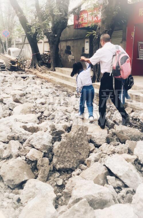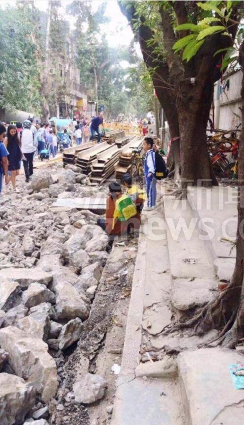 另有網(wǎng)友跟帖表示:同學們求學路坎坷,看得揪心!從現(xiàn)場圖可以看到,學生上下學都要穿過工地。路面被挖開,道路邊上只留下很窄的一條小道。上下學高峰期,成群結(jié)隊的學生在碎石穿行,旁邊小道上行人、三輪、電動單車堵成一鍋粥,存在很大的安全隱患。