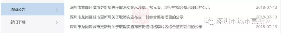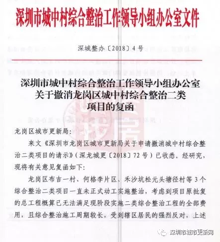 事實(shí)上,早在2018年7月,龍崗區(qū)城市更新局就已經(jīng)依據(jù)相關(guān)規(guī)定要求,批復(fù)取消這幾個(gè)城中村實(shí)施綜合整治的申請(qǐng),并予以公示。此次的批復(fù)公告實(shí)際為區(qū)城市更新局向上級(jí)城中村綜合整治領(lǐng)導(dǎo)和決策機(jī)構(gòu)(深城整辦)的請(qǐng)示文件所反饋的意見復(fù)函。
