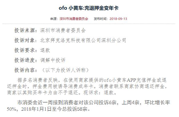 根據(jù)深圳市消費(fèi)者委員會(huì)官網(wǎng)公布的消息,今年針對(duì)ofo的投訴增長(zhǎng)迅速。1月1日至9月13日,投訴數(shù)量為58宗。截至11月14日,僅2個(gè)月時(shí)間,投訴增加180起,總數(shù)達(dá)238宗。