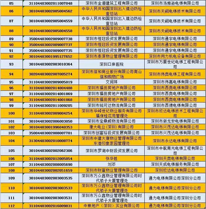 不合格電梯維保單位為:1、深圳市誠禾機電設備有限公司;2、深圳市通宇電梯有限公司;3、深圳市安眾電梯工程有限公司;4、深圳市蓉奧電梯有限公司;5、清遠市中日富士電梯有限公司;6、富士通(深圳)有限公司。