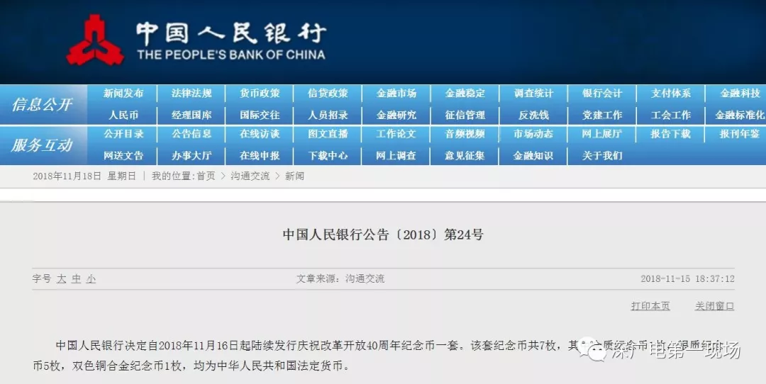 中國(guó)人民銀行決定自2018年11月16日起陸續(xù)發(fā)行慶祝改革開(kāi)放40周年紀(jì)念幣一套。該套紀(jì)念幣共7枚,其中金質(zhì)紀(jì)念幣1枚,銀質(zhì)紀(jì)念幣5枚,雙色銅合金紀(jì)念幣1枚,均為中華人民共和國(guó)法定貨幣。面額分別分100元、50元、10元。