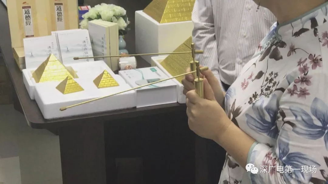 一開始,就上來(lái)了一位叫許姐的團(tuán)隊(duì)負(fù)責(zé)人,但她并沒有著急介紹主角“萬(wàn)能金字塔”,而是不慌不忙地賣弄起另一樣所謂的“神器”——尋龍尺。