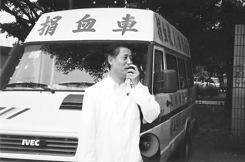 1995年5月7日,捐血車第一天開上街頭,血站老站長楊春森拿著擴(kuò)音器大嗽叭向市民宣傳。 余海蓉 攝