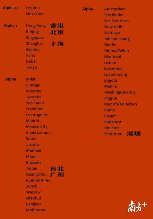 其它的中國城市,香港、北京、上海位于第二檔Alpha+級(jí),分別位于全球3、4、6位,該級(jí)共有8個(gè)城市;臺(tái)北、廣州位于第三檔Alpha級(jí),分別位于全球26、27位,該級(jí)共有23個(gè)城市。