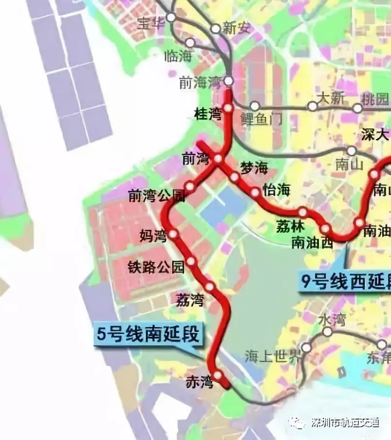 作為三期二階段建設(shè)工程的重要組成部分,地鐵5號線工程建設(shè)南延線南起赤灣站,北至既有5號線起點前海灣站南端,線路全長7.65公里;9號線西延線東起9號線紅樹灣站,由深圳灣總部基地片區(qū)至前海深港合作區(qū),全長約為10.79公里,兩條線均采用地下敷設(shè)方式。