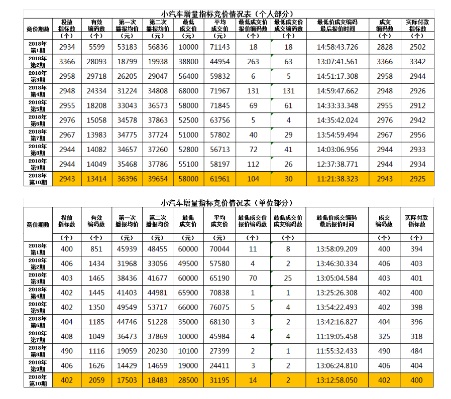 據(jù)悉,10月份個人指標最低成交價58000元,平均成交價61961元。