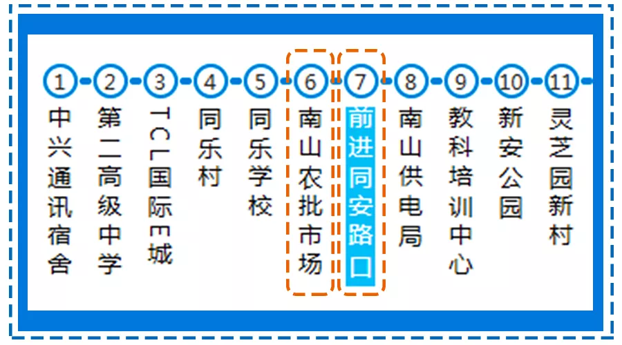 ▲學(xué)校附近有兩個公交站臺——前進同安路口站和南山農(nóng)批市場站。