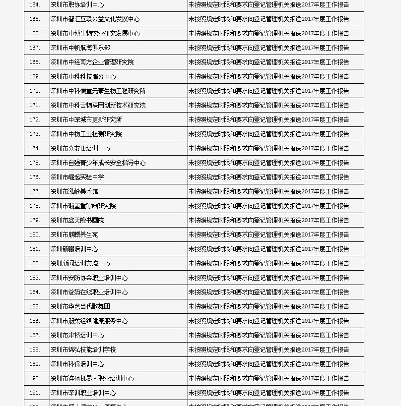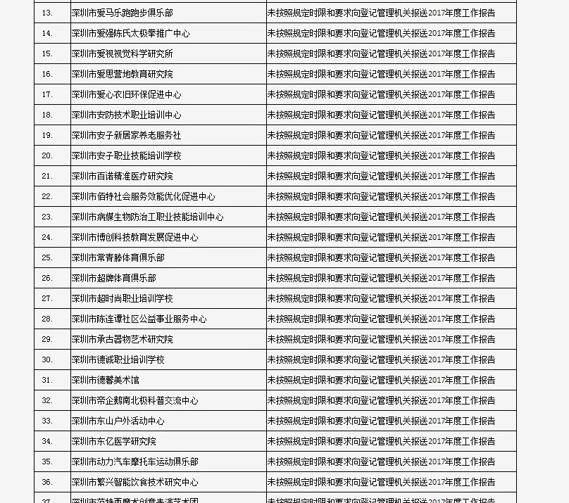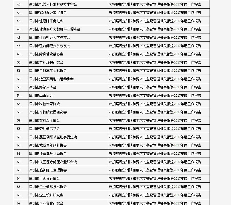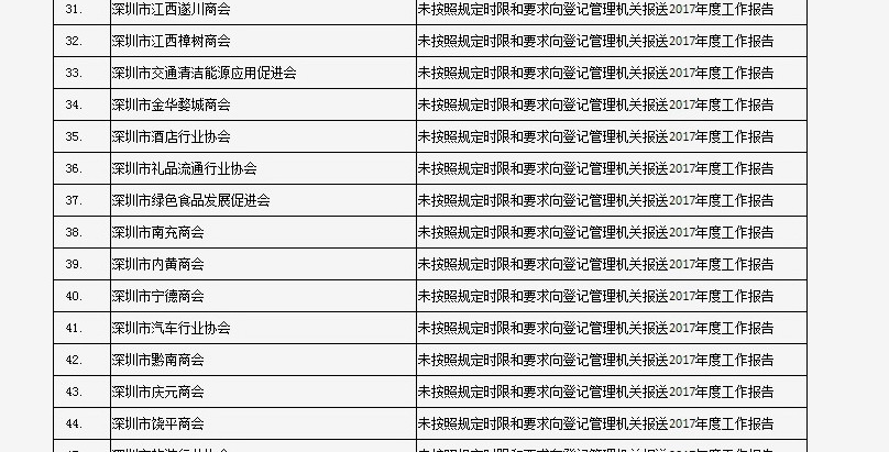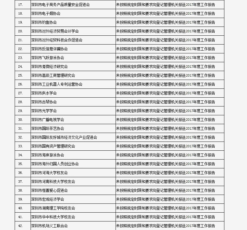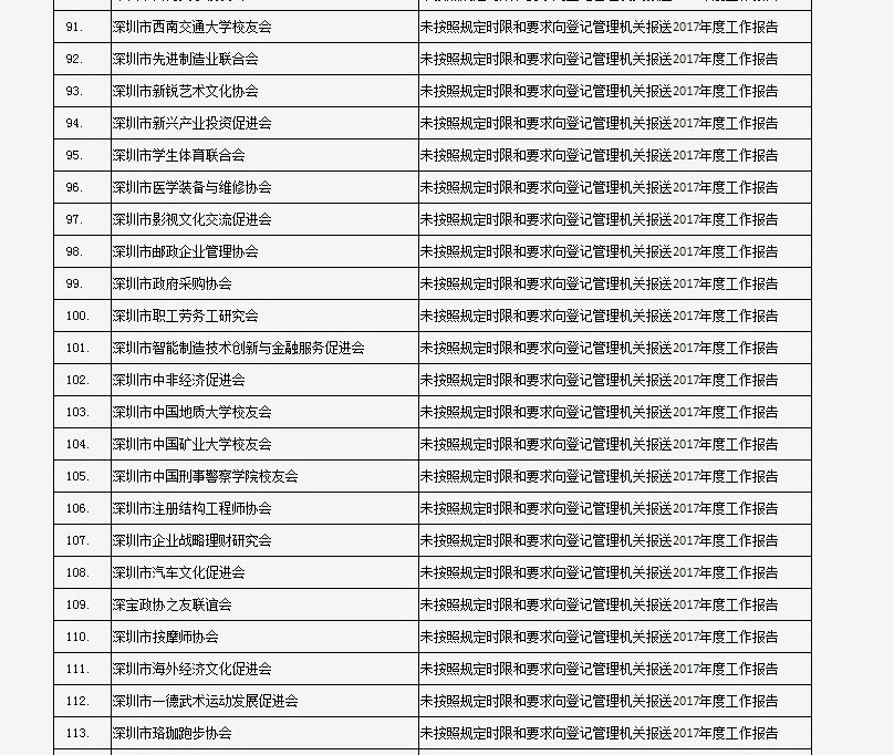 據(jù)深圳市民政局通報(bào),深圳市華中科技大學(xué)校友會(huì)和深圳市深圳大學(xué)校友會(huì)等121家社會(huì)團(tuán)體、深圳市郴州商會(huì)等75家行業(yè)協(xié)會(huì)商會(huì)、企業(yè)家與企業(yè)管理研究院(中國(guó)·深圳)等201家民辦非企業(yè)單位、深圳市明園慈善基金會(huì)等20家基金會(huì),經(jīng)查“未按照規(guī)定時(shí)限和要求向登記管理機(jī)關(guān)報(bào)送2017年度工作報(bào)告”,違反了《社會(huì)組織信用信息管理辦法》《深圳經(jīng)濟(jì)特區(qū)行業(yè)協(xié)會(huì)條例》的相關(guān)規(guī)定,被列入活動(dòng)異常名錄名單。完整版名單已在“深圳民政在線”公布。