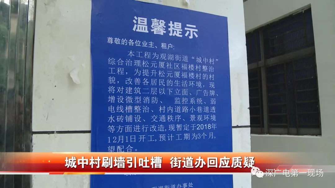 龍華區(qū)觀湖街道辦對城中村實(shí)施改造,按說改造是好事卻有一些居民表達(dá)了不同意見。他們投訴說,外墻粉刷只刷三米高就不往上刷了,還不如不搞。