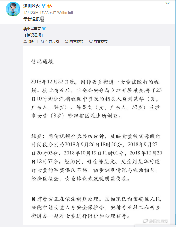 8歲女童遭家暴事件最新消息是,深圳警方對此展開了調(diào)查處理。寶安區(qū)婦聯(lián)已向?qū)毎矃^(qū)人民法院申請女童人身安全保護令。寶安公安局的調(diào)查結(jié)果顯示,網(wǎng)上流傳的3分鐘視頻分別是今年9月、10月的四個時間段拍攝,女童父母對毆打女兒的事實供認不諱,法醫(yī)檢查女童體表未發(fā)現(xiàn)明顯傷痕。