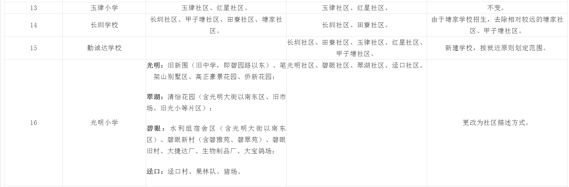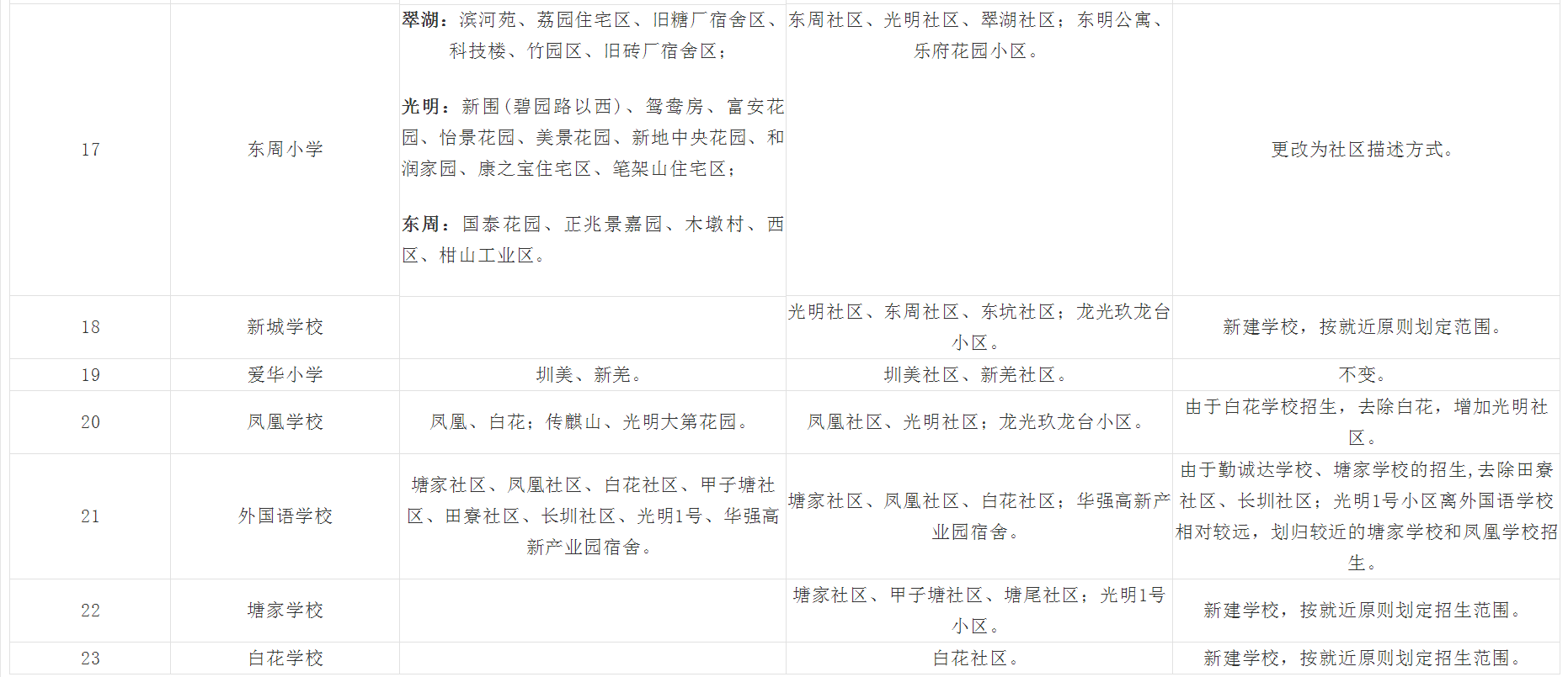 據(jù)悉,2019年光明區(qū)招生原則是原有學(xué)校招生范圍盡量保持不變,新增學(xué)校招生范圍根據(jù)招生規(guī)模、生源情況等按就近原則劃定。由于增加了勤誠達(dá)學(xué)校、信宏城小學(xué)、新城學(xué)校、塘家學(xué)校、白花學(xué)校等5所新建學(xué)校,鳳凰學(xué)校擴(kuò)建項(xiàng)目也已完成,因此,招生片區(qū)擬做調(diào)整為:白花社區(qū)不再安排至光明中學(xué);光明外國語學(xué)校招生去除田寮、長圳、甲子塘片區(qū);光明1號小區(qū)劃歸較近的塘家學(xué)校和鳳凰學(xué)校招生;馬山頭學(xué)校招生去除合水口片區(qū);光明第二中學(xué)招生去除相對較遠(yuǎn)的塘尾片區(qū)。公明二小、下村小學(xué)招生去除相對較遠(yuǎn)的公明社區(qū);長圳學(xué)校招生去除相對較遠(yuǎn)的塘家社區(qū)、甲子塘社區(qū)。鳳凰學(xué)校招生去除白花,增加光明社區(qū)。