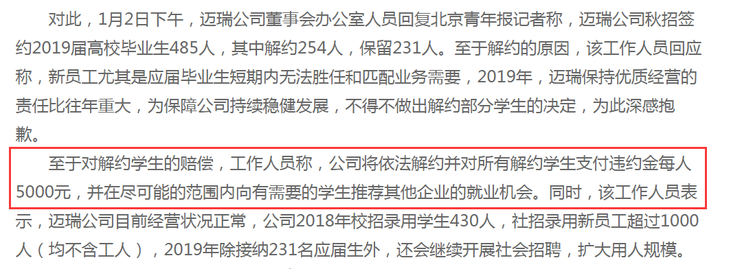 2019年1月2日,邁瑞負責人回應:秋招簽約485人中解約254人,會支付違約金