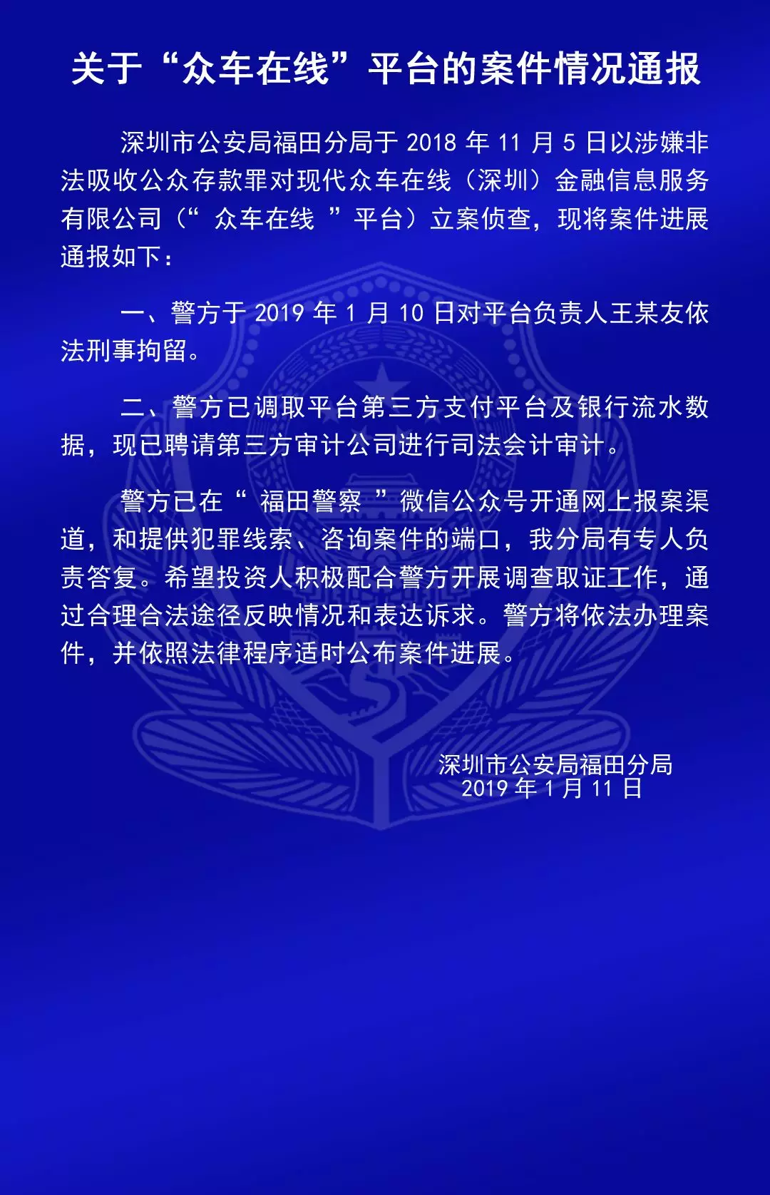 福田公安通報(bào)六家平臺涉嫌非法吸收公眾存款案的情況