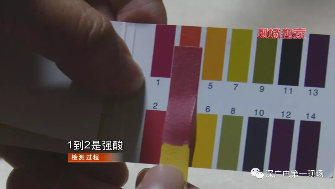 記者在地面上提取了一些廢棄液體,經(jīng)過(guò)PH試紙檢測(cè),酸性數(shù)值在1到2之間。也就是說(shuō),這些液體呈強(qiáng)酸性。