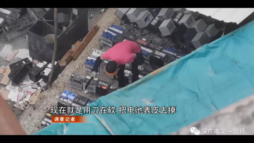 在前期的暗訪中記者發(fā)現(xiàn),3名工人拿著類似砍刀的工具,用簡(jiǎn)單粗爆方法,對(duì)電池進(jìn)行拆解,帶有強(qiáng)腐蝕性的電池廢液,無任何處理,滿地橫流。