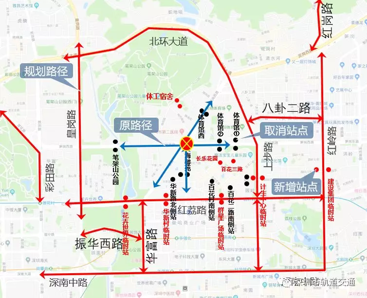 1.臨時取消站點15個:全封閉施工期間,取消體育館、筆架山公園、海馨苑、體育館西、百花一路等5對車站,及華新路北側(cè)站、百花二路南側(cè)站、百花村南側(cè)站等,共計15個站點(含分站),增設(shè)14個臨時停靠點(花卉世界臨時站、華新村臨時站、群星廣場臨時站、計生中心臨時站、建設(shè)集團臨時站、體工宿舍、華富北屋村、長樂花園、百花三路)。(詳見圖3)