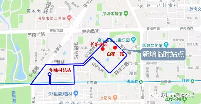 (2)新增華新村總站環(huán)線(單邊順時(shí)針運(yùn)行),線路單向途經(jīng)華富路、華新路、百花四路、百花三路、百花二路、百花五路、百花四路、華強(qiáng)北路、紅荔路。停靠華新村總站、華新村、市話大廈①、華新路、百花四路、長(zhǎng)樂(lè)花園、百花三路、百花二路、百花村、百花四路、華新村總站。(詳見(jiàn)圖6)