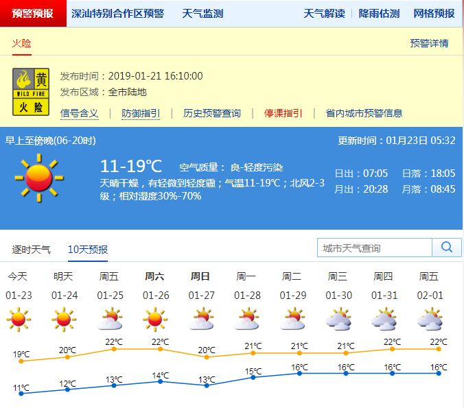 深圳新聞網(wǎng)2019年1月23日訊 深圳今日白天,天氣干燥,部分地區(qū)能見度較低,有輕微到輕度霾;氣溫11-19℃;偏北風2-3級;相對濕度30%-70%,濕度低,火險預警生效中。24-27日依然晴天干燥,部分時間有輕微到輕度霾;28日多云,濕度回升。天氣持續(xù)干燥,日溫差大,早晚較冷。