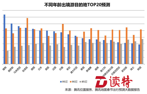 根據(jù)年齡劃分,18歲以下青少年最喜歡前往東南亞國(guó)家,而60歲以上老年人最青睞的是歐美發(fā)達(dá)國(guó)家。進(jìn)一步研究發(fā)現(xiàn),85后最愛去的國(guó)家是韓國(guó)、新加坡、瑞士、阿聯(lián)酋、越南,涵蓋東亞、東南亞和歐洲,90后最愛去的國(guó)家是菲律賓、印度、新加坡、馬來(lái)西亞、柬埔寨,全部在東南亞地區(qū),95后最愛去的國(guó)家是緬甸、俄羅斯、馬來(lái)西亞、菲律賓、德國(guó),涵蓋東南亞和歐洲。