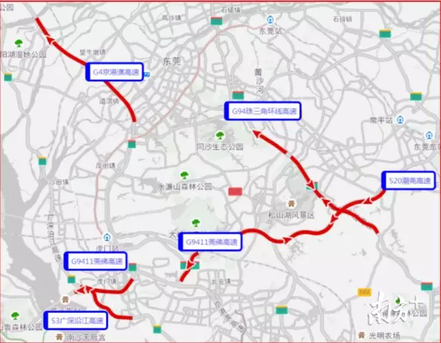 建議途經(jīng)廣深高速公路由深圳往廣州方向(北行)的車輛,在北行長安出口、虎門出口繞行國道或轉(zhuǎn)到常虎高速公路到廣州。