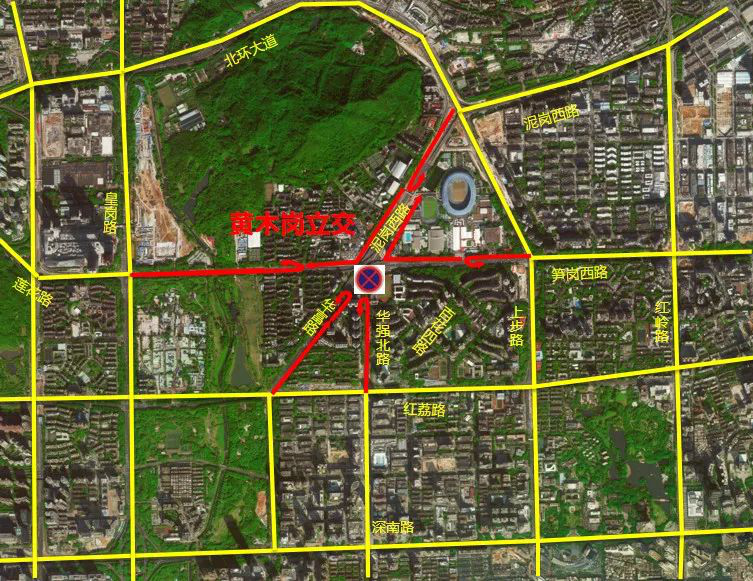 原經黃木崗立交節(jié)點的交通需從北環(huán)大道、紅荔路、深南大道、彩田路、皇崗路、上步路、紅嶺路等外圍道路繞行。