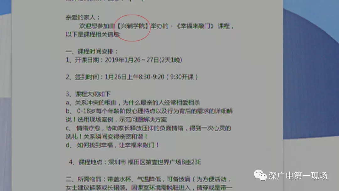 深廣電第一現(xiàn)場2019年2月1日訊 寒假前夕,龍華區(qū)不少家長向我們欄目反映,從上學(xué)期開始他們通過學(xué)校老師的介紹,接觸到了一個教育機構(gòu)。這個校外的培訓(xùn)機構(gòu),主要給家長傳授親子教育和家庭相處的技巧,按說這應(yīng)該是一件好事,可是一些家長卻發(fā)現(xiàn),參加了一些課程之后,不光家庭關(guān)系沒有變好,反而帶來了不少家庭矛盾?