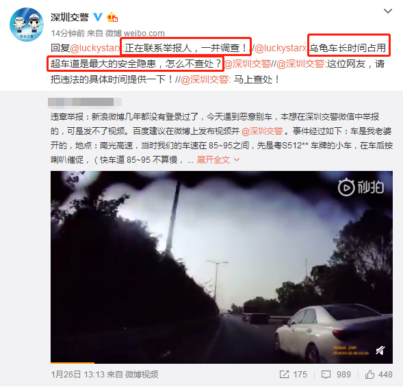 1月28日,深圳交警在微博回復(fù)該網(wǎng)友稱(chēng)馬上查處,并希望爆料博主能提供具體的時(shí)間