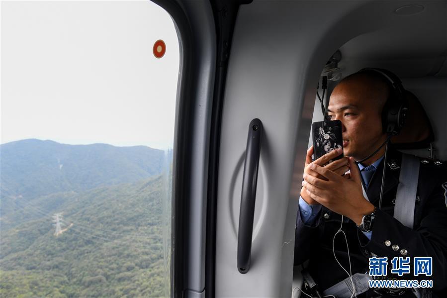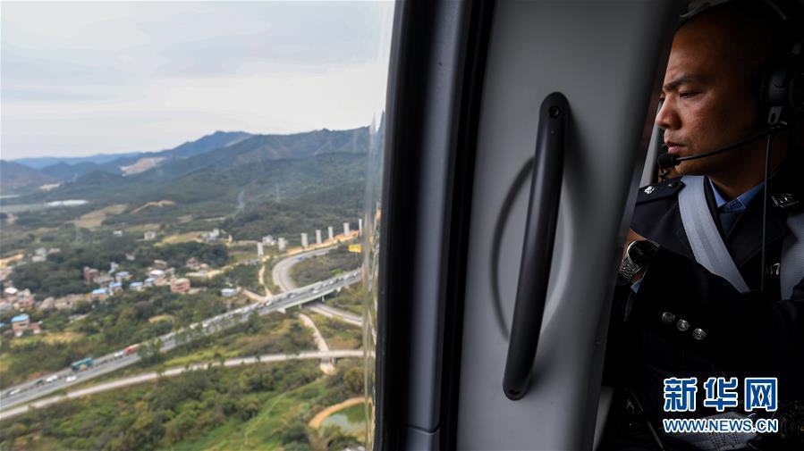 2月1日,深圳市公安局交通警察局指揮處民警劉松超在直升機(jī)上了解路面情況。2019年春運(yùn),深圳市公安局交通警察局開啟陸空立體探路模式,首次啟用直升機(jī)探路。據(jù)介紹,此次直升機(jī)探路將開展5次,屆時交警選取代表性線路從空中探察路面情況,及時為司機(jī)提供立體交通通行指引。新華社記者 毛思倩 攝