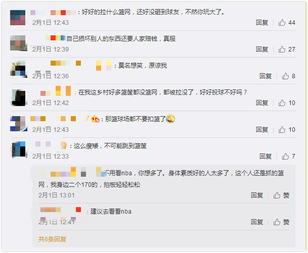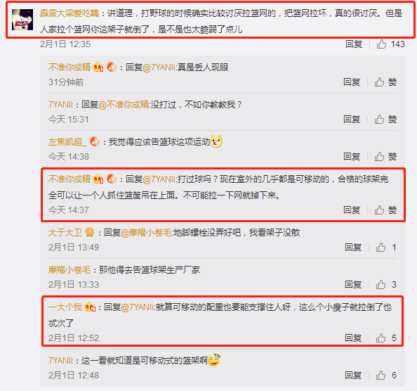 還有一些網(wǎng)友借機表達了自己對某類人的"墻裂"不滿?。]事兒拉什么球框啊,以為在打 NBA?。ⅲ⒒钤?,打球就煩不能扣還裝 X的"......