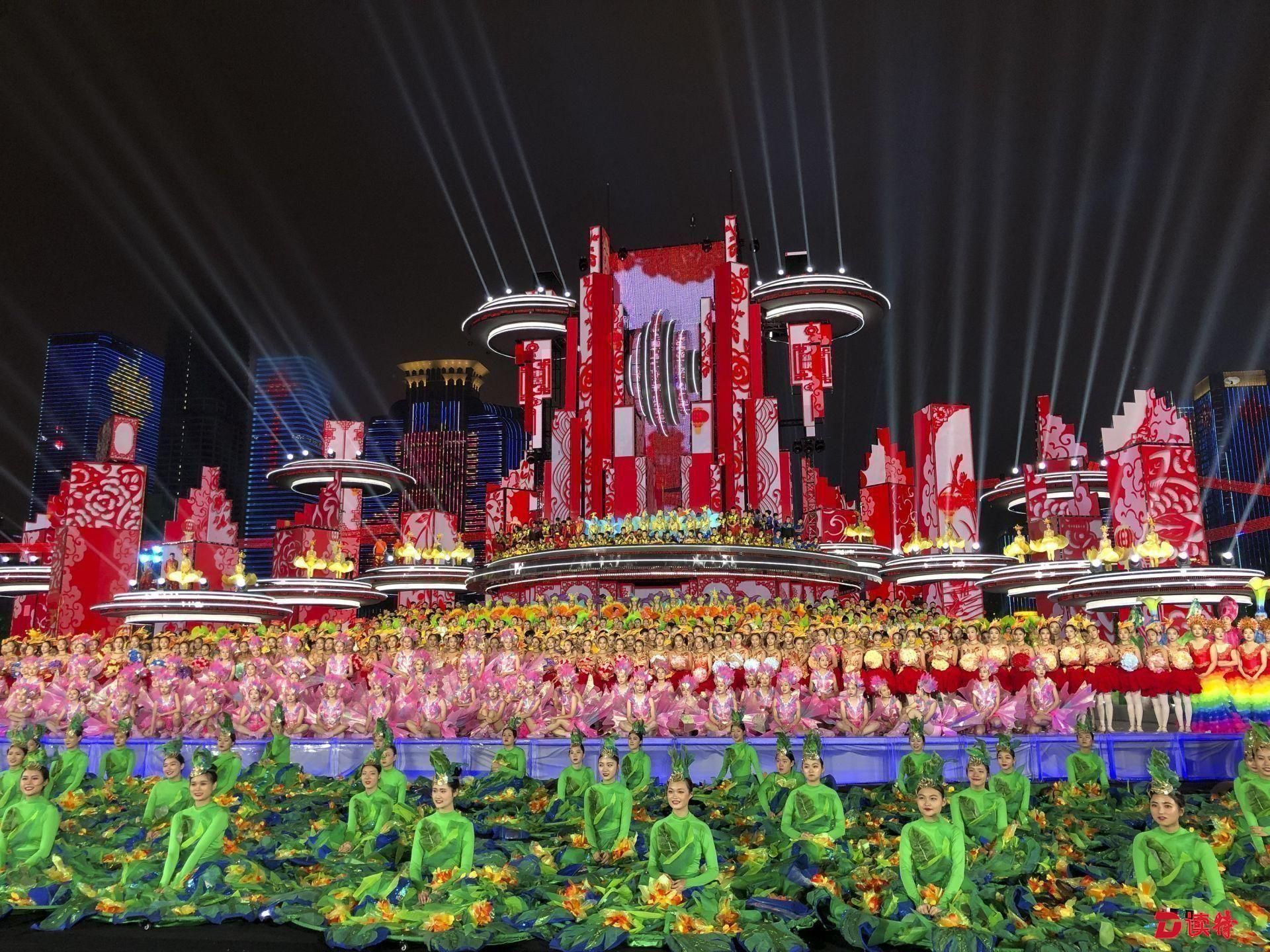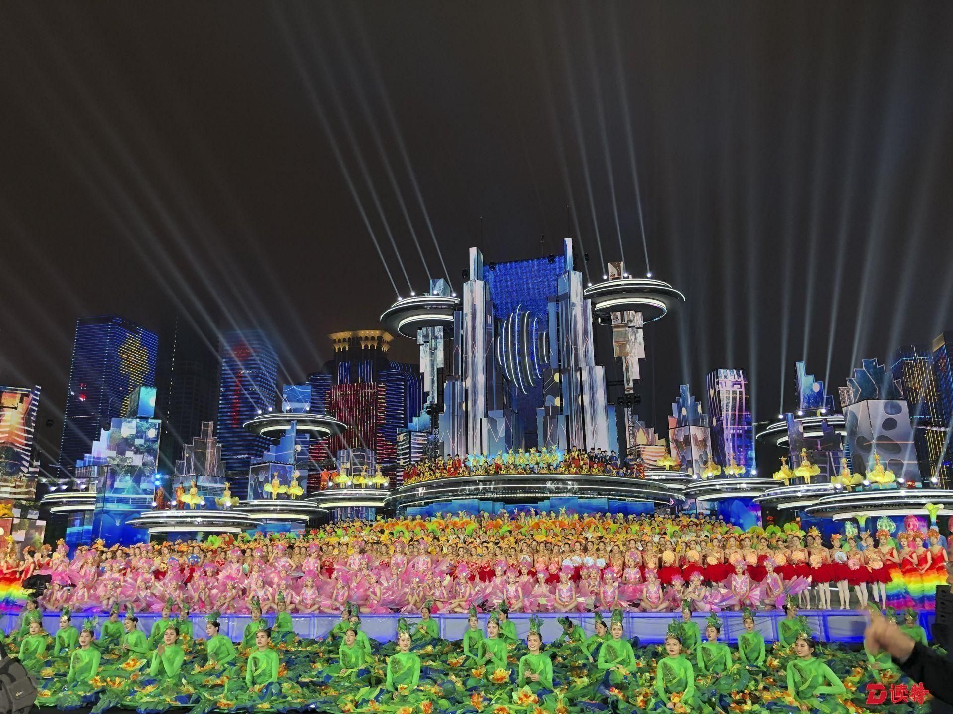 在春意盎然的南海之濱,充滿未來感的主舞臺與舞臺后方43棟樓宇燈光秀融為一體,天地為幕、光影作畫,五彩斑斕、綺麗多姿,把現(xiàn)場春晚的小舞臺融入了深圳這座城市的大舞臺。