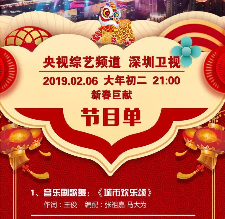 “擁抱春天——2019中央廣播電視總臺春節(jié)聯(lián)歡晚會深圳分會場節(jié)目展播暨深圳春節(jié)聯(lián)歡晚會”(以下簡稱“深圳春晚”)將于明晚21:00在央視綜藝頻道和深圳衛(wèi)視同步播出。