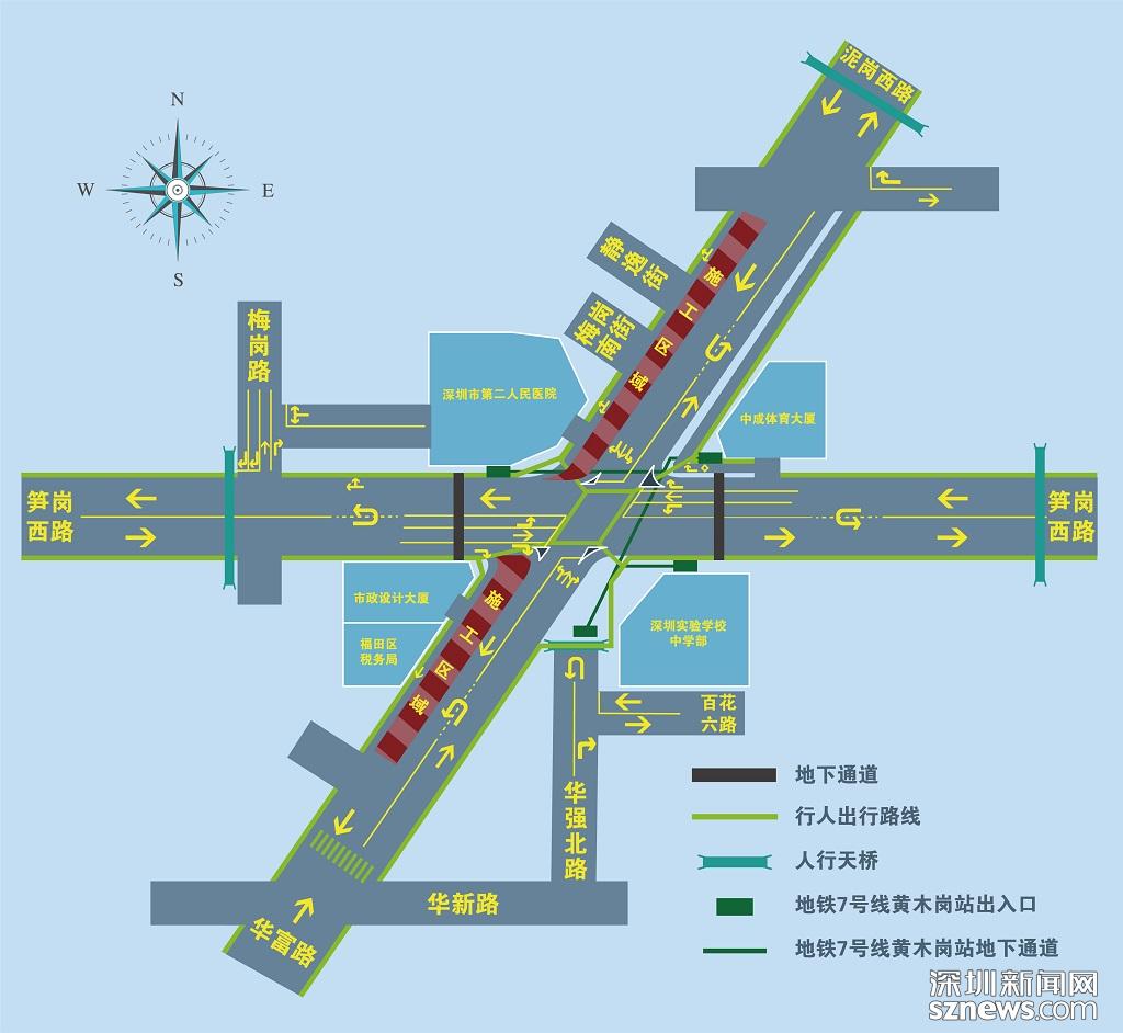 需要注意的是,恢復路面交通后,行人過街通道也同步調(diào)整。市民可直接從華富-筍崗平交路口穿行過街,也可由筍崗西路的兩條地下通道通過。同時,地鐵7號線黃木崗站在運營時段(06:22-23:54)也可為市民過街提供方便。此外,泥崗西路北端、華強北路北端及筍崗西路東西兩端均設有人行天橋可供通行。