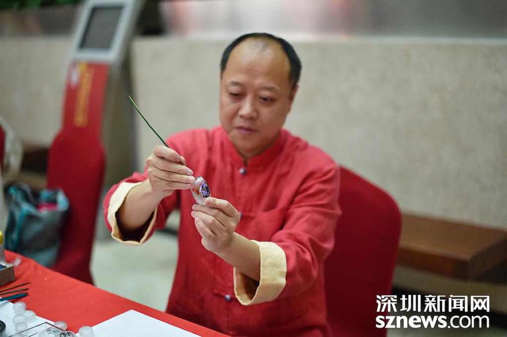 活動現(xiàn)場,內(nèi)畫藝人正在展示其作品。內(nèi)畫是我國特有的傳統(tǒng)工藝,現(xiàn)代內(nèi)畫藝術(shù)源于京派,分為京、冀、魯、粵、秦五大流派,河北衡水被文化部命名為“中國內(nèi)畫之鄉(xiāng)”。