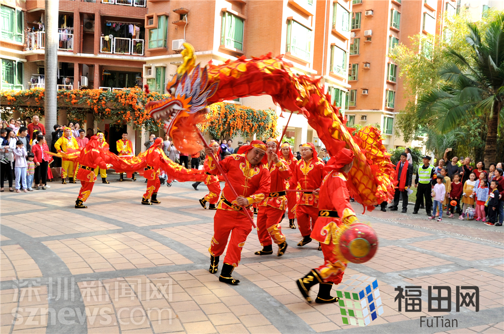 除此之外,巡游隊伍更是會在小區(qū)各個圍合內(nèi)空地上村民進行年俗表演:氣勢如虹的威風鑼鼓、活靈活現(xiàn)的舞龍表演、精彩絕倫的醒獅獻瑞表演。每次表演結束都收獲了村民如潮水般熱情的掌聲和贊嘆,讓大家驚嘆不已的是這般精彩的表演竟不是來自專業(yè)隊伍而是由管理處員工組成,并在忙碌的工作之余進行排練。