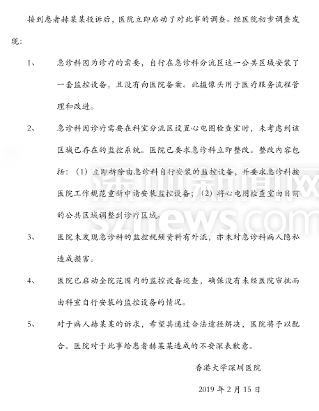 近日,赫女士在港大深圳醫(yī)院掀衣做心電圖檢查時(shí)發(fā)現(xiàn),有個(gè)攝像頭對(duì)著她,赫女士要求查看錄像未果遂報(bào)警處理。