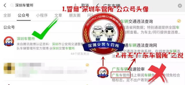 不法分子建立的公眾號(hào)冒用“深圳車管所”的官方頭像,并在簡(jiǎn)介中使用了子虛烏有的“廣東車管所”。